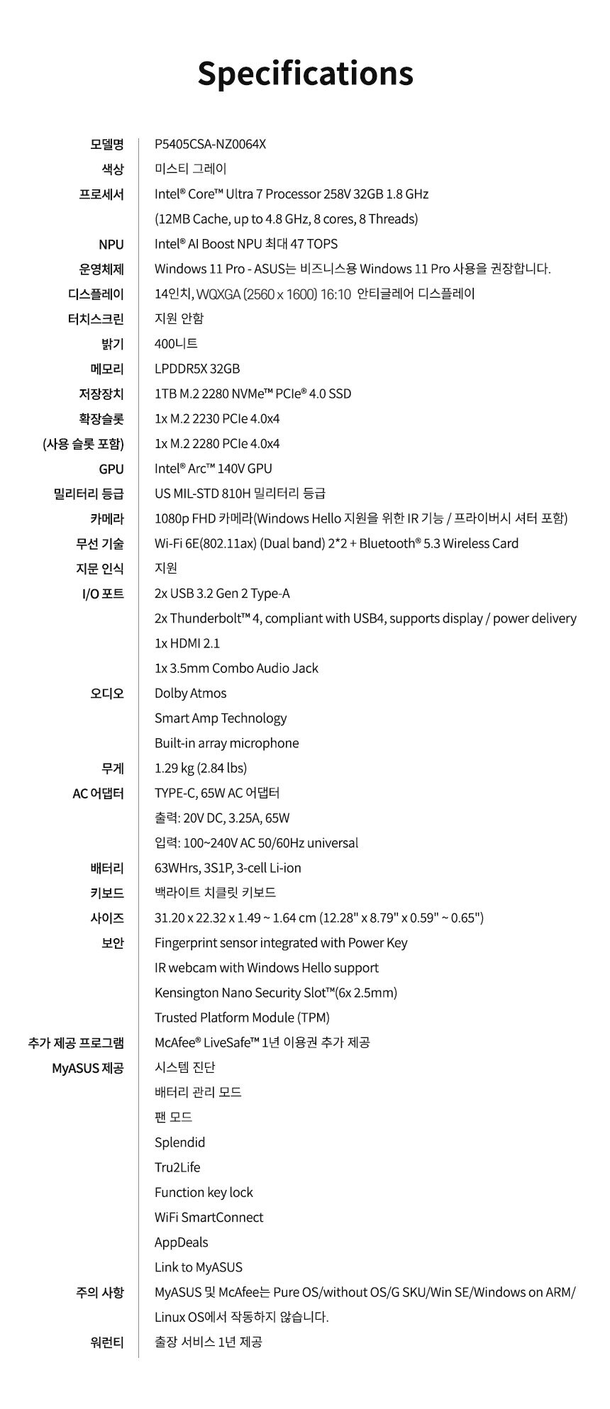 AI 노트북 U7 47TOPS ASUS ExpertBook P5405CSA-NZ0064X